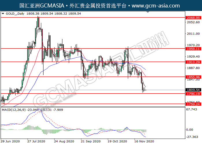 GOLD_,Daily:黄金突破后持续下行。MACD仍显示空头信号,动能略减,短期可继续看空为主。上方关注1855.95压力和1910.30压力,下方关注1796.20支撑和1759.25支撑。