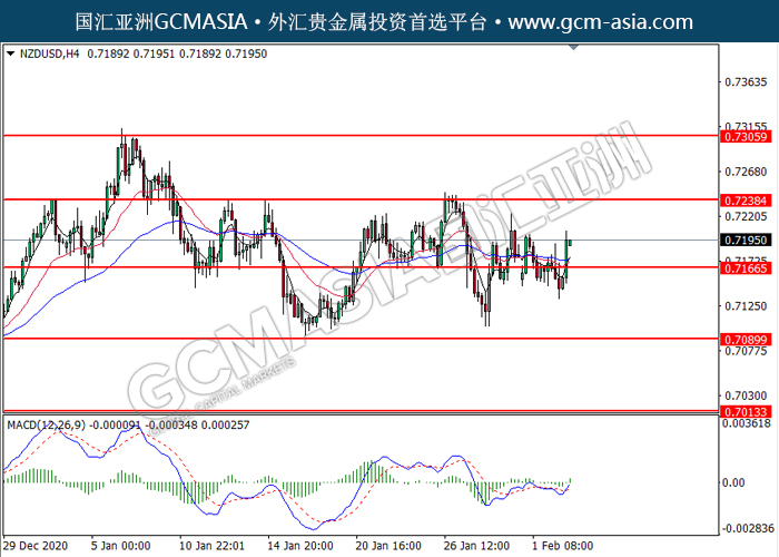 030221 NZDUSD by willy | Feb 3, 2021 | 纽元兑美元 | 0 comments GCMAsia-NZDUSD NZDUSD 2021-02-03 NZDUSD,H4: 纽美突破后持续上行。MACD转向多头,动能略增,短期可关注多头为主。上方关注0.7240和0.7305压力,下方关注0.7165支撑和0.7090支撑。