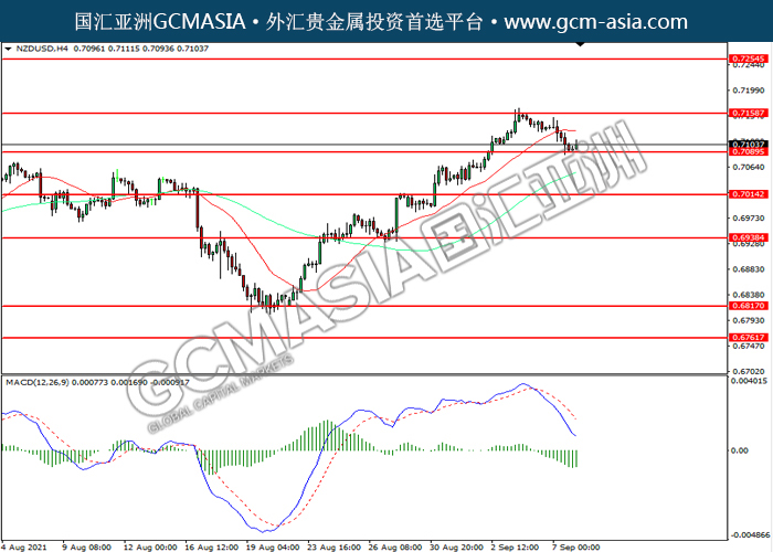 NZDUSD,H4: 纽美震荡下行。MACD空头动能略增,短期可关注空头为主。上方关注0.7160和0.7255压力,下方关注0.7090支撑和0.7015支撑。