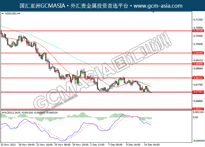 151221 NZDUSD by willy | Dec 15, 2021 | 纽元兑美元 | 0 comments NZDUSD,H4: 纽美震荡下行,目前测试前期支撑。然而,MACD空头动能略减,短期可关注技术性回调为主。上方关注0.6815和0.6890压力,下方关注0.6735支撑和0.6640支撑。