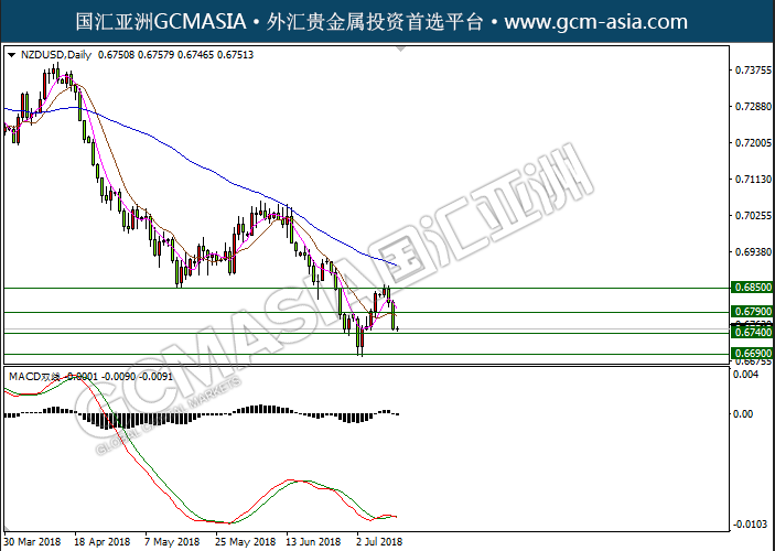 NZDUSD D1:纽美运行下行趋势,高位回落,均线拐向65日均线上方压制;目前测试前期整点支撑,若下破承压下方空间进一步打开,MACD双线缠绕,动能趋缓。短期关注能否下破关键支撑。上方关注0.6790压力和0.6850压力,下方关注0.6740支撑和0.6690支撑。