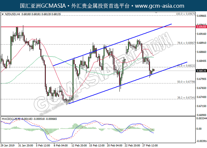NZDUSD,H4:纽美处于上行通道,目前测试底部。MACD已形成死叉,动能偏弱,若下破可继续看空。上方关注0.6820压力和0.6890压力,下方关注0.6780支撑和0.6735支撑。