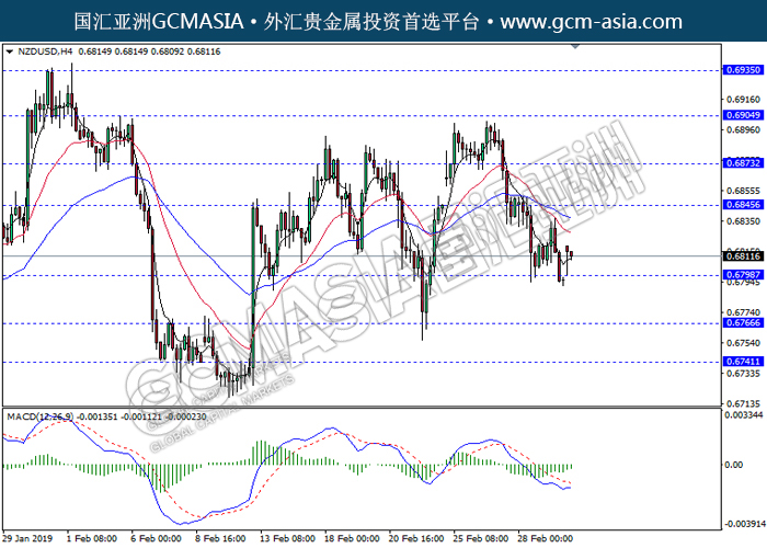 20190304-NZDUSD-午间 by keyk | Mar 4, 2019 | 纽元兑美元 | 0 comments GCMAsia - NZDUSD NZDUSD 2019-03-04 NZDUSD,H4:纽美触底反弹上行。MACD动能略增,短期继续关注多头反弹空为主。上方关注0.6845压力和0.6875压力,下方关注0.6800支撑和0.6765支撑。