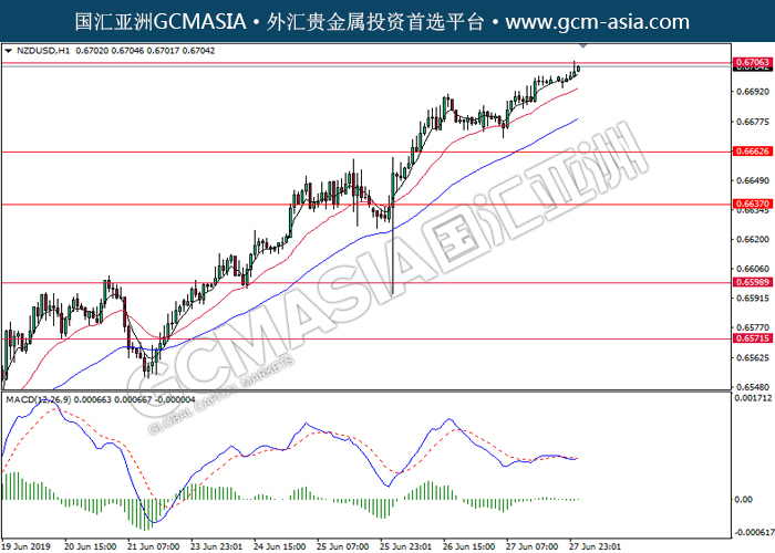 NZDUSD,H1:纽美震荡上行。由于MACD并没有显示任何明确信号,建议等到更多信号出现后才做交易。上方关注0.6705压力和0.6740压力,下方关注0.6665支撑和0.6635支撑。