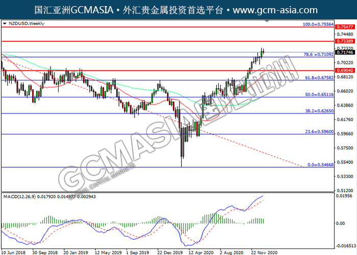NZDUSD,Weekly: 纽美突破前期压力,震荡上行。然而,MACD多头动能略减,短期可关注技术性回调为主。上方关注0.7340和0.7550压力,下方关注0.7110支撑和0.6905支撑。