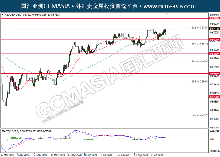 20200918 NZDUSD by willy | Sep 17, 2020 | 纽元兑美元 | 0 comments GCMAsia - NZDUSD NZDUSD 2020-09-18 NZDUSD,Daily:纽美低位反弹。MACD空头动能有所略减,若上破压力位可继续看多。上方关注0.6760压力和0.6920压力,下方关注0.6600支撑和0.6510支撑。