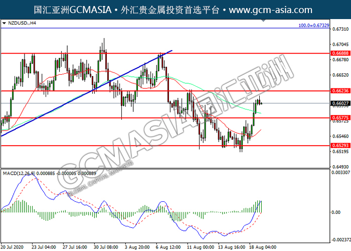 NZDUSD,H4: 纽美震荡上行,目前靠近前期压力。然而,MACD多头动能略减,短期可关注技术性回调为主。上方关注0.6625和0.6690压力,下方关注0.6575支撑和0.6530支撑。