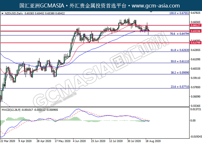 NZDUSD,Daily: 紐美高位承压后回落,目前测试着支撑位。然而,MACD显示空头动能转弱,短期可关注多头反弹为主。上方关注0.6615和0.6755压力,下方关注0.6535支撑和0.6480支撑。