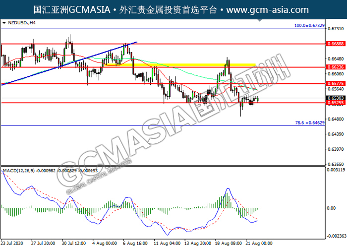 20200824 NZDUSD by willy | Aug 24, 2020 | 纽元兑美元 | 0 comments GCMAsia-NZDUSD NZDUSD 2020-08-24 NZDUSD,H4: 纽美震荡盘整,目前测试前期支撑。MACD多头动能略增,短期可关注多头为主。上方关注0.6575和0.6625压力,下方关注0.6520支撑和0.6465支撑。