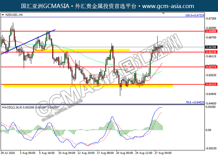 NZDUSD,H4: 纽美突破前期压力,震荡上行。然而,MACD多头动能略减,短期可关注技术性回调。上方关注0.6690和0.6735压力,下方关注0.6625支撑和0.6575支撑。