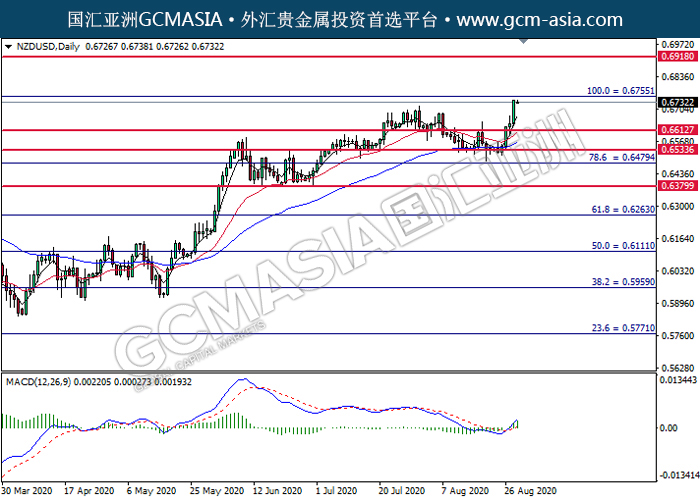 NZDUSD,Daily: 紐美突破后持续上行,目前测试着压力位。MACD显示多头信号,若突破可关注多头走势为主。上方关注0.6755和0.6920压力,下方关注0.6615支撑和0.6535支撑。
