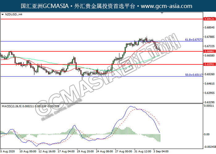 20200904 NZDUSD by willy | Sep 4, 2020 | 纽元兑美元 | 0 comments GCMAsia-NZDUSD NZDUSD 2020-09-04 NZDUSD,H4: 纽美震荡下行,目前测试前期支撑。MACD空头动能略增,若下破可关注空头为主。上方关注0.6755和0.6910压力,下方关注0.6685支撑和0.6595支撑。