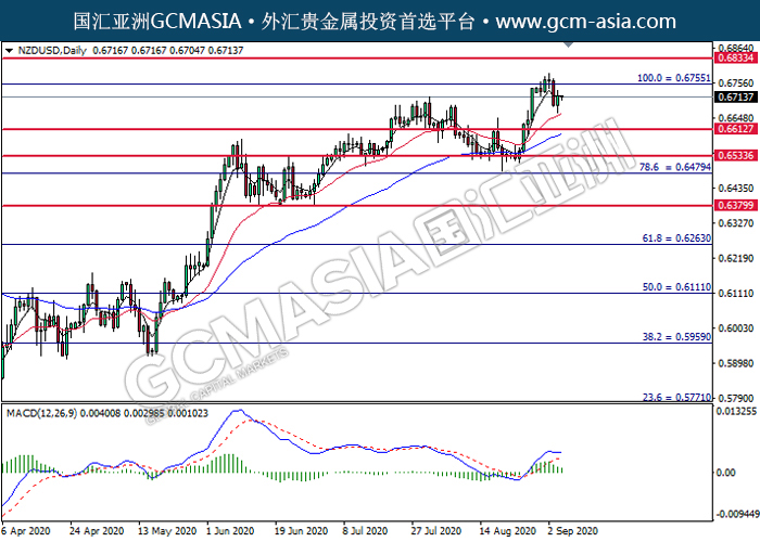 20200907 NZDUSD by willy | Sep 7, 2020 | 纽元兑美元 | 0 comments GCMAsia-NZDUSD NZDUSD 2020-09-07 NZDUSD,Daily: 紐美高位承压后回落。MACD显示空头信号,中期可关注空头走势为主。上方关注0.6755和0.6835压力,下方关注0.6615支撑和0.6535支撑。