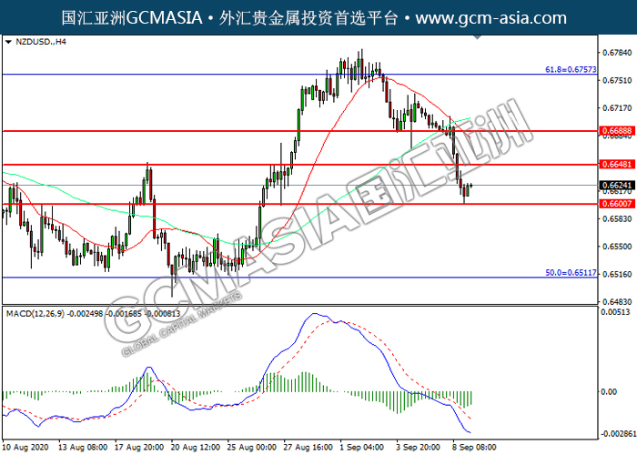 NZDUSD,H4: 纽美低位反弹。MACD空头动能略减,短期可关注多头为主。上方关注0.6650和0.6690压力,下方关注0.6600支撑和0.6510支撑。