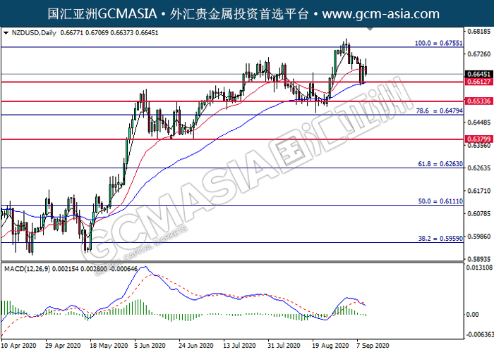 20200911 NZDUSD by willy | Sep 11, 2020 | 纽元兑美元 | 0 comments GCMAsia-NZDUSD NZDUSD 2020-09-11 NZDUSD,Daily: 紐美低位反弹。MACD显示空头信号,短期可关注空头回调为主。上方关注0.6755和0.6835压力,下方关注0.6615支撑和0.6535支撑。