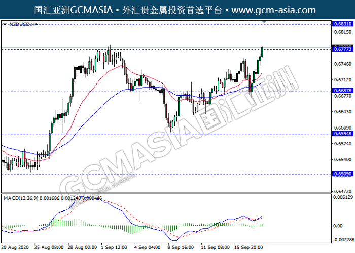 NZDUSD,H4: 纽美多头排列,目前测试前期压力。MACD形成金叉,动能略增,若突破继续看多为主。上方关注0.6775和0.6830压力,下方关注0.6685支撑和0.6595支撑。