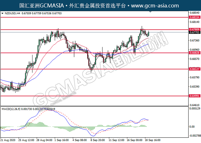 20200921 NZDUSD-午间 by skylow | Sep 21, 2020 | 纽元兑美元 | 0 comments GCMAsia - NZDUSD NZDUSD 2020-09-21 NZDUSD,H4: 紐美低位反弹。然而,MACD显示多头动能转弱,短期可关注空头回调为主。上方关注0.6780和0.6835压力,下方关注0.6685支撑和0.6615支撑。