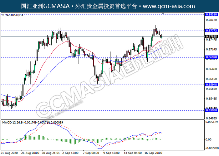 NZDUSD,H4: 纽美高位承压回落。MACD形成死叉,多头动能略减,短期继续看空回调为主。上方关注0.6775和0.6830压力,下方关注0.6685支撑和0.6595支撑。