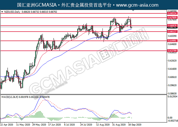 20200922 NZDUSD-午间 by willy | Sep 22, 2020 | 纽元兑美元 | 0 comments GCMAsia-NZDUSD NZDUSD 2020-09-22 NZDUSD,Daily: 紐美突破后持续下行。MACD显示空头动能转强,短期可关注空头走势为主。上方关注0.6685和0.6780压力,下方关注0.6615支撑和0.6500支撑。