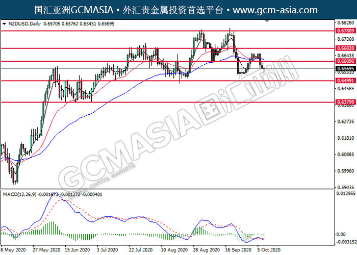 NZDUSD,Daily: 纽美突破后持续下行。MACD显示空头信号,动能略减,短期继续看空为主。上方关注0.6610和0.6685压力,下方关注0.6500支撑和0.6380支撑。