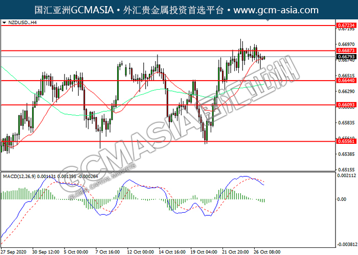 20201027 NZDUSD by willy | Oct 27, 2020 | 纽元兑美元 | 0 comments GCMAsia-NZDUSD NZDUSD 2020-10-27 NZDUSD,H4: 纽美高位回落。MACD空头动能略增,短期可关注空头为主。上方关注0.6685和0.6725压力,下方关注0.6645支撑和0.6610支撑。
