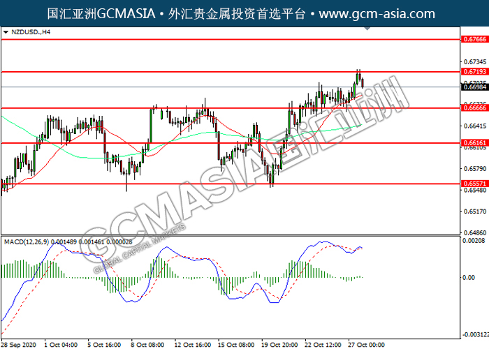 20201028 NZDUSD by willy | Oct 28, 2020 | 纽元兑美元 | 0 comments GCMAsia-NZDUSD NZDUSD 2020-10-28 NZDUSD,H4: 纽美高位回落。MACD多头动能略减,短期可关注空头为主。上方关注0.6720和0.6765压力,下方关注0.6665支撑和0.6615支撑。