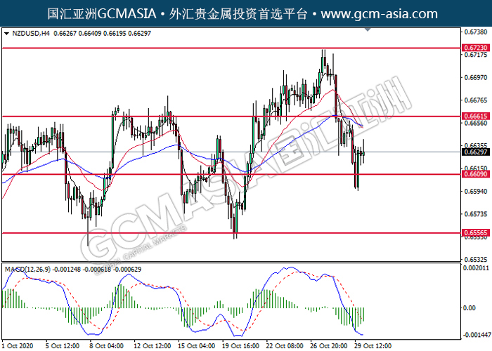 20201030 NZDUSD-午间 by keyk | Oct 30, 2020 | 纽元兑美元 | 0 comments GCMAsia - NZDUSD NZDUSD 2020-10-30 NZDUSD,H4: 纽美低位反弹。MACD空头动能略减,短期可持续关注多头为主。上方关注0.6660和0.6725压力,下方关注0.6610支撑和0.6555支撑。