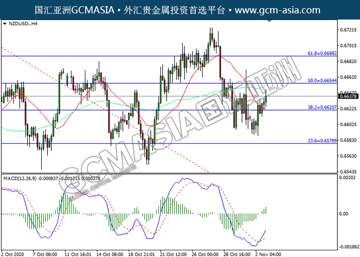 20201103 NZDUSD-午间 by willy | Nov 3, 2020 | 纽元兑美元 | 0 comments GCMAsia-NZDUSD NZDUSD 2020-11-03 NZDUSD,H4: 纽美突破前期压力,震荡上行。MACD多头动能略增,短期可关注多头为主。上方关注0.6655和0.6690压力,下方关注0.6620支撑和0.6580支撑。
