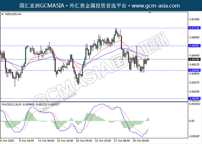 NZDUSD,H4: 纽美触底反弹上行。MACD形成金叉,动能略增,短期继续看多反弹为主。上方关注0.6670和0.6725压力,下方关注0.6595支撑和0.6510支撑。