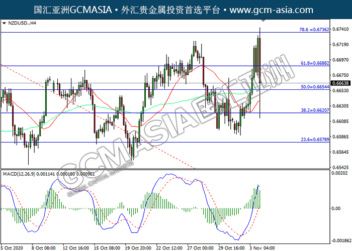 20201104 NZDUSD-午间 by willy | Nov 4, 2020 | 纽元兑美元 | 0 comments GCMAsia-NZDUSD NZDUSD 2020-11-04 NZDUSD,H4: 纽美高位回落,目前测试前期支撑。MACD多头动能略减,若下破可关注空头为主。上方关注0.6690和0.6735压力,下方关注0.6655支撑和0.6620支撑。