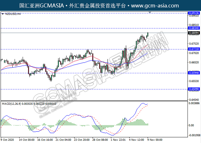 NZDUSD,H4: 纽美多头排列,目前测试靠近前期压力。MACD动能持续略增,若突破继续看多为主。上方关注0.6835和0.6915压力,下方关注0.6720支撑和0.6595支撑。