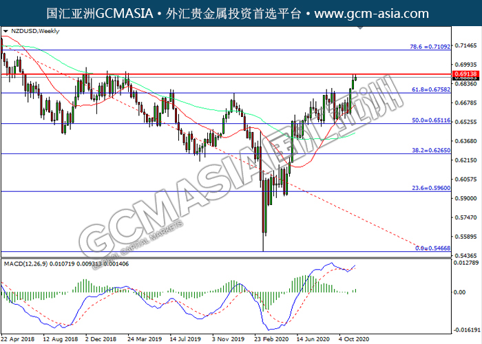 NZDUSD,Weekly: 纽美震荡上行,目前测试前期压力。MACD已形成金叉,动能转强,若突破可关注多头为主。上方关注0.6915和0.7110压力,下方关注0.6760支撑和0.6510支撑。