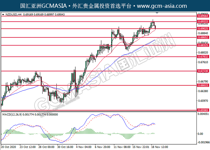 NZDUSD,H4: 纽美高位承压后回落,目前测试着支撑位。MACD动能略减,若突破关注空头为主。上方关注0.6935和0.6955压力,下方关注0.6905支撑和0.6865支撑。