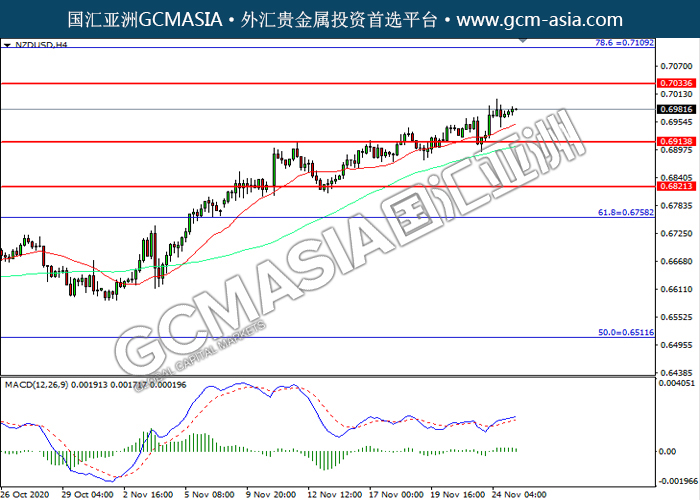 20201125 NZDUSD-午间 by willy | Nov 25, 2020 | 纽元兑美元 | 0 comments GCMAsia-NZDUSD NZDUSD 2020-11-25 NZDUSD,H4: 纽美震荡上行。然而,MACD多头动能略减,短期可关注技术性回调为主。上方关注0.6980和0.7010压力,下方关注0.6955支撑和0.6935支撑。