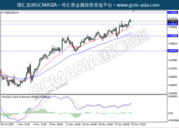 NZDUSD,H4: 纽美突破前期压力,震荡上行。然而,MACD多头动能有所略减,短期关注技术性空头回调趋势为主。上方关注0.7055和0.7155压力,下方关注0.6985支撑和0.6910支撑。