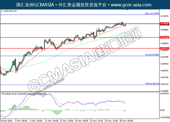 NZDUSD,H4: 纽美震荡上行,目前测试前期压力。然而,MACD空头动能有所略增,短期可关技术性回调为主。上方关注0.7035和0.7110压力,下方关注0.6915支撑和0.6820支撑。