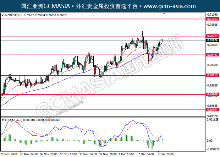 20201203 NZDUSD by willy | Dec 3, 2020 | 纽元兑美元 | 0 comments GCMAsia-NZDUSD NZDUSD 2020-12-03 NZDUSD,H1: 纽美突破后持续上行。MACD转向多头,动能略增,短期可关注多头为主。上方关注0.7075和0.7100压力,下方关注0.7045支撑和0.7010支撑。