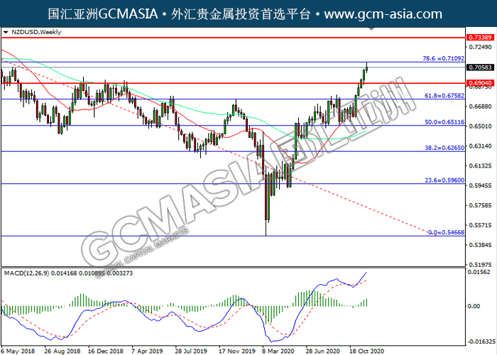 NZDUSD,Weekly: 纽美震荡上行,目前测撒前期压力。MACD多头动能有所略增,若突破可关注多头为主。上方关注0.7110和0.7340压力,下方关注0.6905支撑和0.6760支撑。