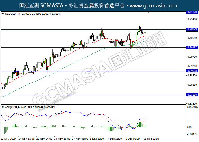 NZDUSD,H4: 纽美震荡上行,目前测试前期压力。然而,MACD多头动能有所略减,短期关注技术性空头回调趋势为主。上方关注0.7095和0.7175压力,下方关注0.7010支撑和0.6900支撑。