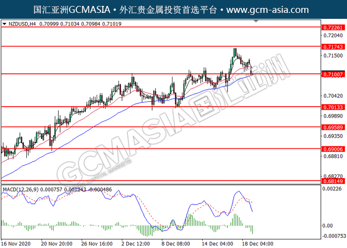 NZDUSD,H4: 纽美高位承压后回落,目前测试着支撑位。MACD转向空头,动能转弱,若突破可关注空头为主。上方关注0.7175和0.7225压力,下方关注0.7100支撑和0.7015支撑。