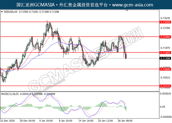 20210128 NZDUSD by willy | Jan 28, 2021 | 纽元兑美元 | 0 comments GCMAsia-NZDUSD NZDUSD 2021-01-28 NZDUSD,H4: 纽美突破后持续下行。MACD转向空头,动能略减,短期可关注空头为主。上方关注0.7165和0.7240压力,下方关注0.7090支撑和0.7015支撑。