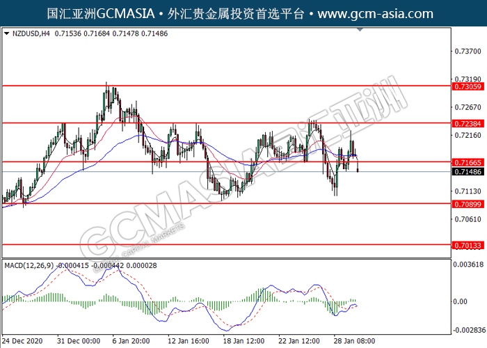 20210201 NZDUSD by willy | Jan 31, 2021 | 纽元兑美元 | 0 comments GCMAsia-NZDUSD NZDUSD 2021-02-01 NZDUSD,H4: 纽美突破后持续上行。MACD转向空头,动能略减,短期可关注空头为主。上方关注0.7165和0.7240压力,下方关注0.7090支撑和0.7015支撑。