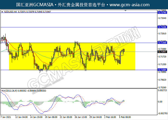 NZDUSD,H4: 纽美仍区间震荡交易。然而,MACD形成金叉,动能略增,短期关注多头趋势为主。上方关注0.7235和0.7310压力,下方关注0.7110支撑和0.7010支撑。