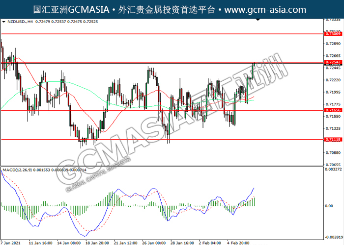 NZDUSD,H4: 纽美震荡上行,目前测试前期压力。MACD多头动能略增,若突破可关注多头趋势为主。上方关注0.7255和0.7305压力,下方关注0.7165支撑和0.7115支撑。