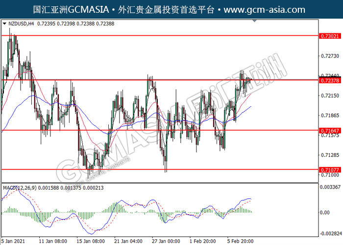 NZDUSD,H4: 纽美突破后持续上行,目前测试着压力位。然而,MACD转向空头,动能略减,短期可关注空头为主。上方关注0.7235和0.7300压力,下方关注0.7165支撑和0.7105支撑。