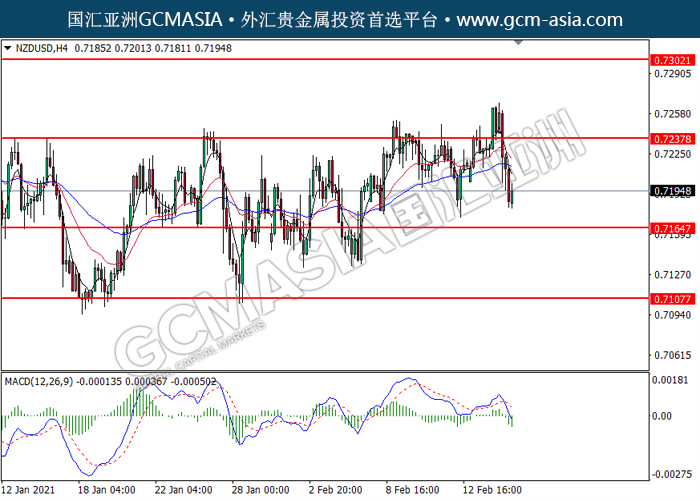 20210217 NZDUSD-午间 by keyk | Feb 17, 2021 | 纽元兑美元 | 0 comments GCMAsia-NZDUSD NZDUSD 2021-02-17 NZDUSD,H4: 纽美突破后持续下行。MACD转向空头,动能略减,短期可关注空头为主。上方关注0.7240和0.7300压力,下方关注0.7165支撑和0.7105支撑。
