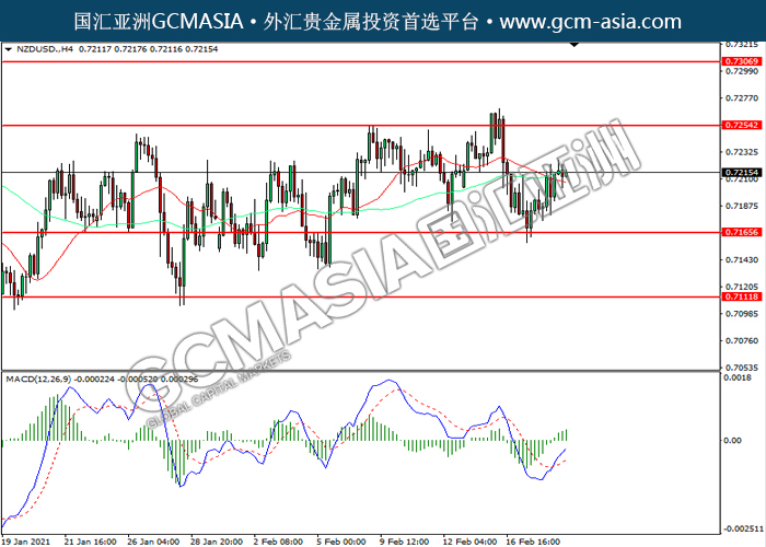 20210219 NZDUSD-午间 by keyk | Feb 19, 2021 | 纽元兑美元 | 0 comments GCMAsia-NZDUSD NZDUSD 2021-02-19 NZDUSD,H4: 纽美震荡上行。MACD多头动能略增,短期关注多头趋势为主。上方关注0.7255和0.7305压力,下方关注0.7165支撑和0.7110支撑。