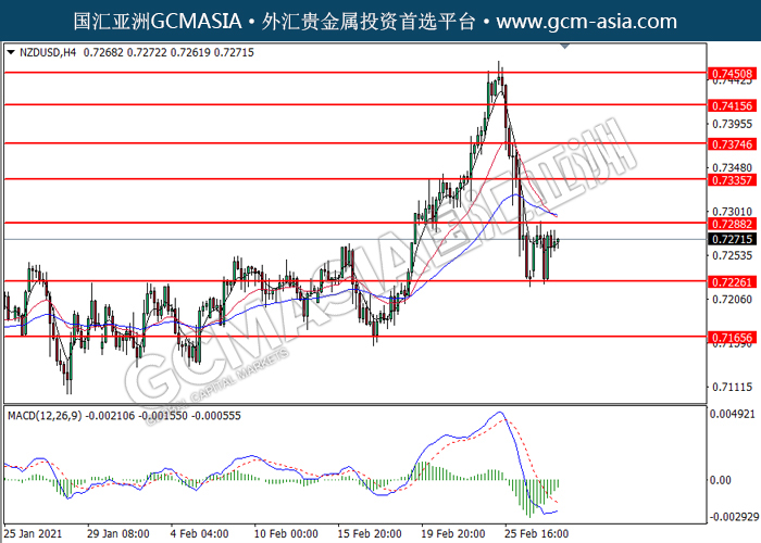 20210302 NZDUSD by willy | Mar 2, 2021 | 纽元兑美元 | 0 comments GCMAsia - NZDUSD NZDUSD 2021-03-02 NZDUSD,H4: 纽美低位反弹。MACD转向多头,动能略增,短期可关注多头为主。上方关注0.7290和0.7335压力,下方关注0.7225支撑和0.7165支撑。