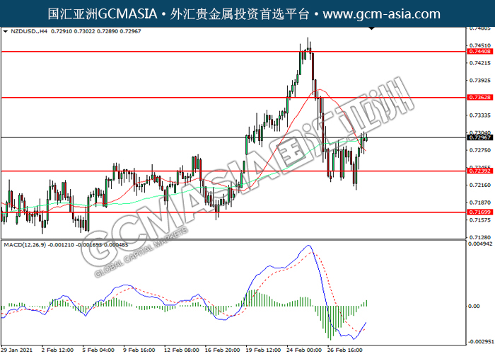 20210303 NZDUSD-午间 by keyk | Mar 3, 2021 | 纽元兑美元 | 0 comments GCMAsia-NZDUSD NZDUSD 2021-03-03 NZDUSD,H4: 纽美低位反弹。MACD多头动能略增,短期可关注多头为主。上方关注0.7365和0.7440压力,下方关注0.7240支撑和0.7170支撑。