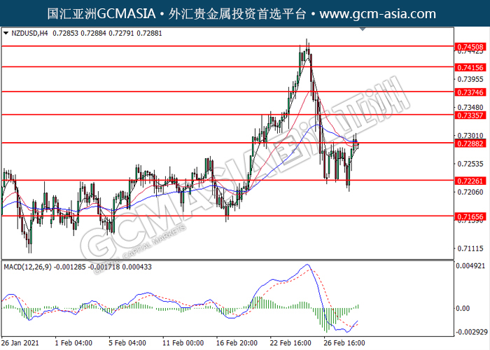 NZDUSD,H4: 纽美低位反弹,目前测试着压力位。MACD转向多头,动能略增,若突破可关注多头为主。上方关注0.7290和0.7335压力,下方关注0.7225支撑和0.7165支撑。